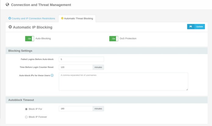 When Auto-Blocking is enabled a failed attempt is logged whenever a user enters an incorrect password or tries to log in with an invalid username. If DoS Protection is selected then any attempt to connect to the server will be counted towards auto-blocking, even if the connection doesn’t attempt to authenticate. This can help prevent DoS attacks that try to tie up connections and overwhelm the server. DoS Protection can also be useful for services continuously probing the server with garbage data and attempting to find security vulnerabilities. However, a successful login from an IP address resets the Failed Login Attempts counter to zero for the IP address.